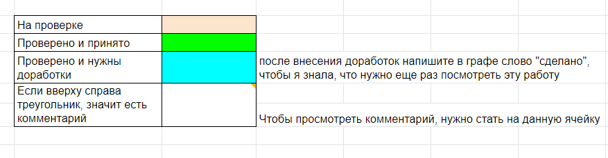 В таблице мы будем использовать определенные цвета, которые помогут вам понять, на какой стадии находится ваша работа. Под таблицей внизу есть расшифровка цветовых обозначений.