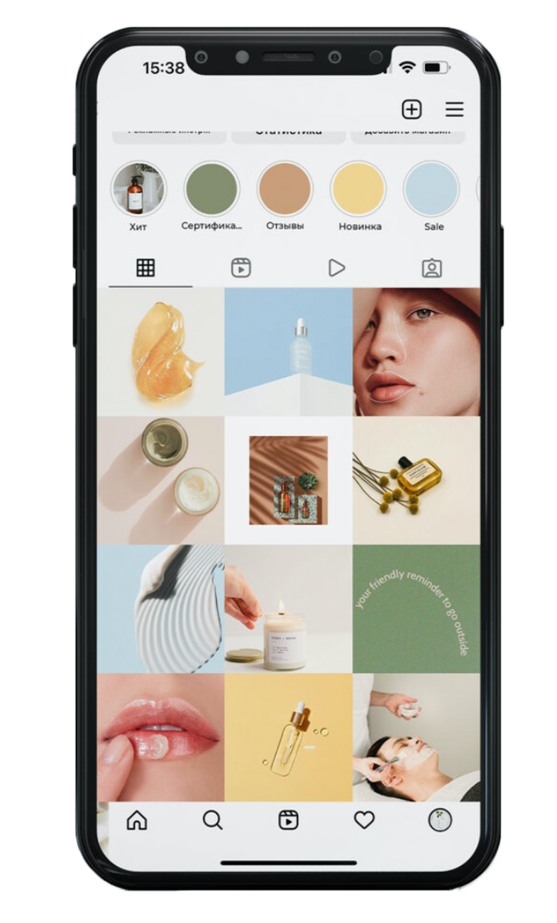 и коммуникационной стратегии (цветовые решения, аватар, иконки актуальных Stories, шаблоны Stories, tone of voice и т.д.)