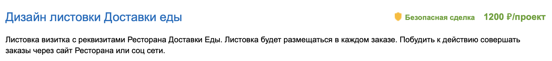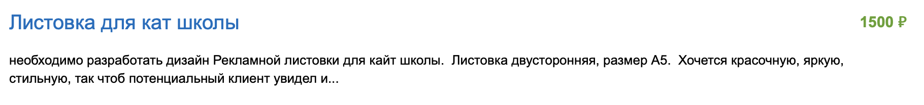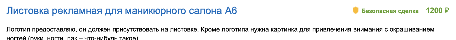 Исходя из цен, понимаем, что на рынке листовка стоит около 1300₽, но тут мы должны помнить про адекватность. На биржах цены всегда немного занижены, поэтому можем ее немного поднять и называть цену заказчику (но это только в начале своего пути, потом цену, которую видим на бирже умножаем минимум на 2).